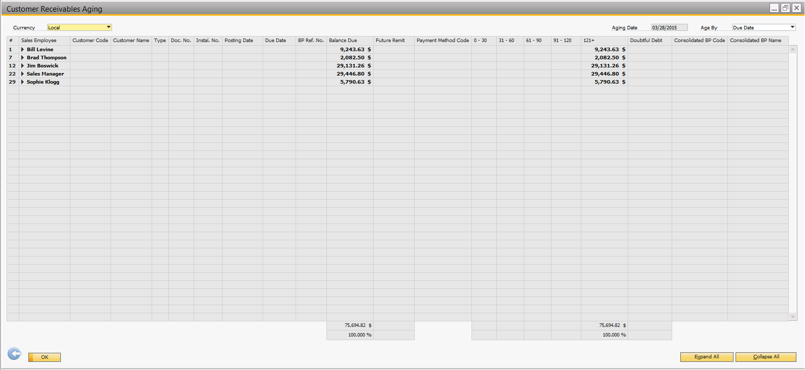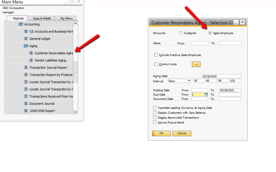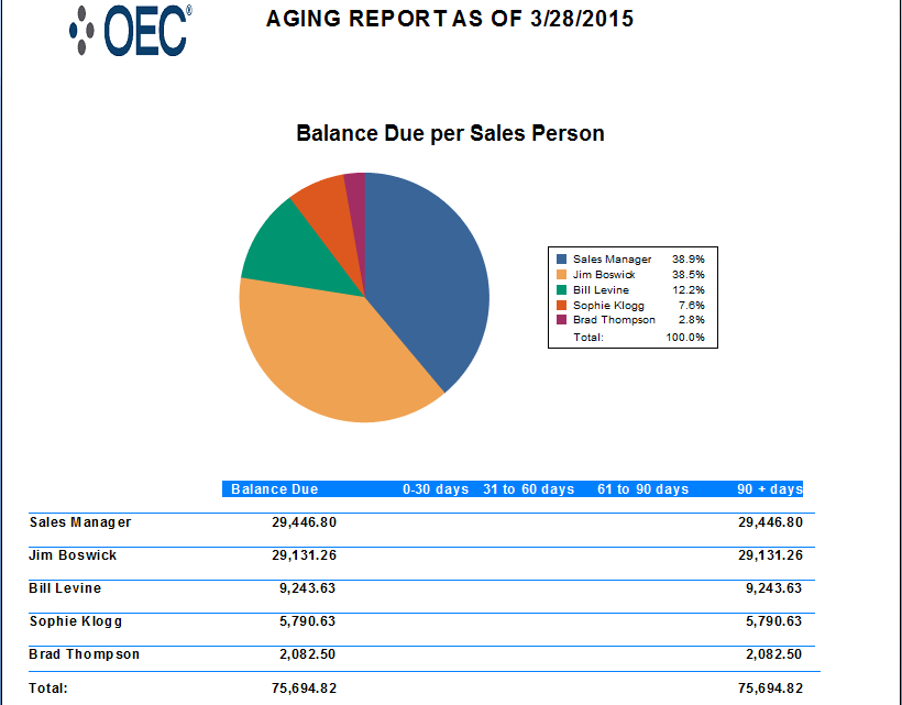 So, let’s say the sales director of the company wants to have an Aging Report by sales employee. He wants this report so his sales employees can follow up with their customers and make easier for accounting to collect the money.